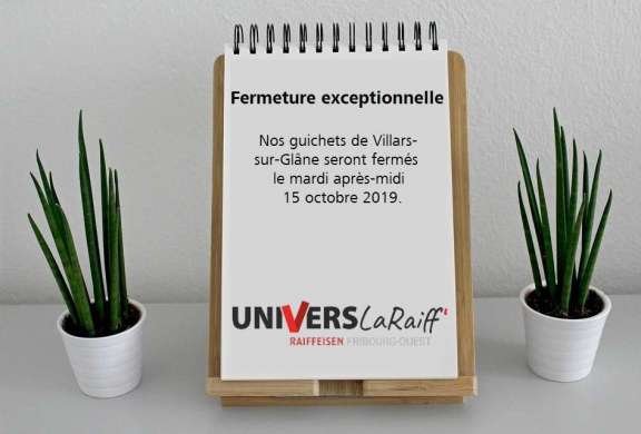 Nos guichets à la route de Moncor 12 à Villars-sur-Glâne seront exceptionnellement fermés le mardi après midi 15 octobre 2019.